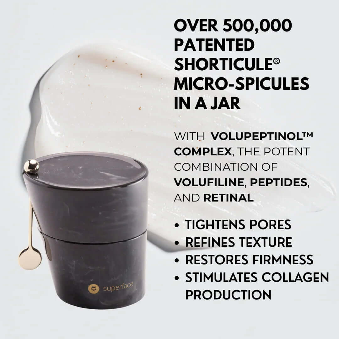 Over 500,000 Shorticule® micro-spicules engineered to be 2x shorter and 1.5x finer than industry standards that create microscopic channels in the skin for deep, targeted absorption. Suspended in our proprietary Volupeptinol™ complex and infused with 24K gold, this regenerating cream delivers retinal, peptides, and collagen activators precisely where skin needs them most.